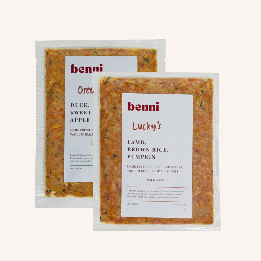 benni has no preservatives and isn't designed to be shelf-stable so you can be sure your dog gets only the freshest food with minerals and nutrients still intact. Read more on our high quality recipes and ingredients here.